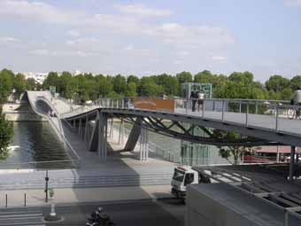 2006-09-08 新しい橋 日記 #練習用 昨日のプールは新しくできた歩行者専用のシモーヌ・ボーボワール橋(写真)からとったもの。一緒にいた人は橋の名を嫌っていたが、現代人の名前をつけるのは難しい。ノートルダム寺院前の広場が最近前法皇のジャン・ポール2世広場と改められ、反対デモがあった。改名したのがホモの社会党パリ市長だから意外な改名。